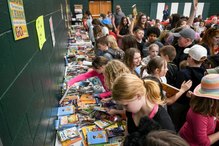At top and bottom, children sift through books after a winning card is verified during Book Bingo at Ashkar Elementary School on Thursday. The annual event, presented by the Parent Teacher Association, coincides with the Read Across America program celebrating the birthday of Dr. Suess. Above ...